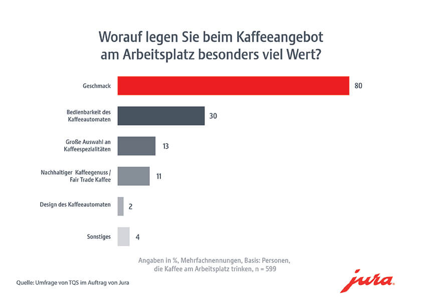 Die beliebteste Form der Kaffeezubereitung am Arbeitsplatz ist der Kaffeevollautomat: 48 % der Befragten geben an, einen im Einsatz zu haben. Auf dem zweiten Platz landen mit 20 % Kapselsysteme, dicht gefolgt von Kaffeeautomaten mit Bezahlfunktion (19 %), Filterkaffee und Mokkakannen dahingegen sind weit abgeschlagen. Die heimischen Arbeitnehmenden stellen an ihren Kaffee hohe Ansprüche: 80 % sagen, dass der Geschmack entscheidend ist, für 30 % ist die Bedienbarkeit des Kaffeevollautomaten am wichtigsten und 13 % legen besonders viel Wert auf eine große Auswahl an Kaffeespezialitäten. Anforderungen, denen die Kaffeevollautomaten der Schweizer Traditionsmarke Jura mehr als gerecht werden.